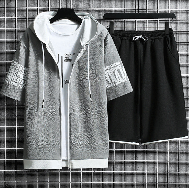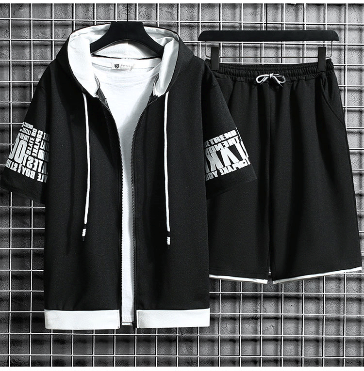 후드 반팔 코트 × 반바지  여름철에 활약하는 세트,항상 산뜻하고 쾌적. 1세트₩37,900;2세트₩49,900